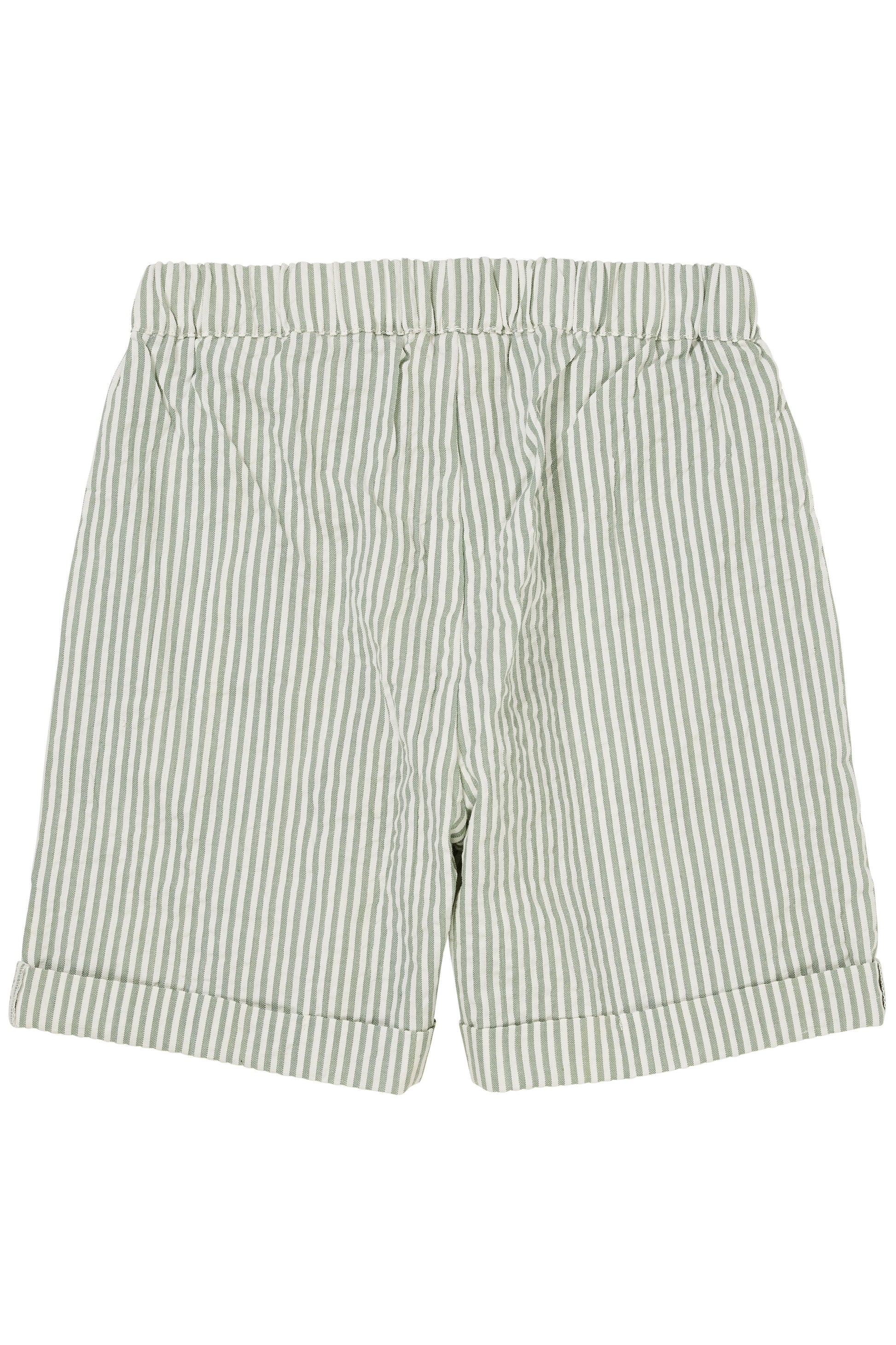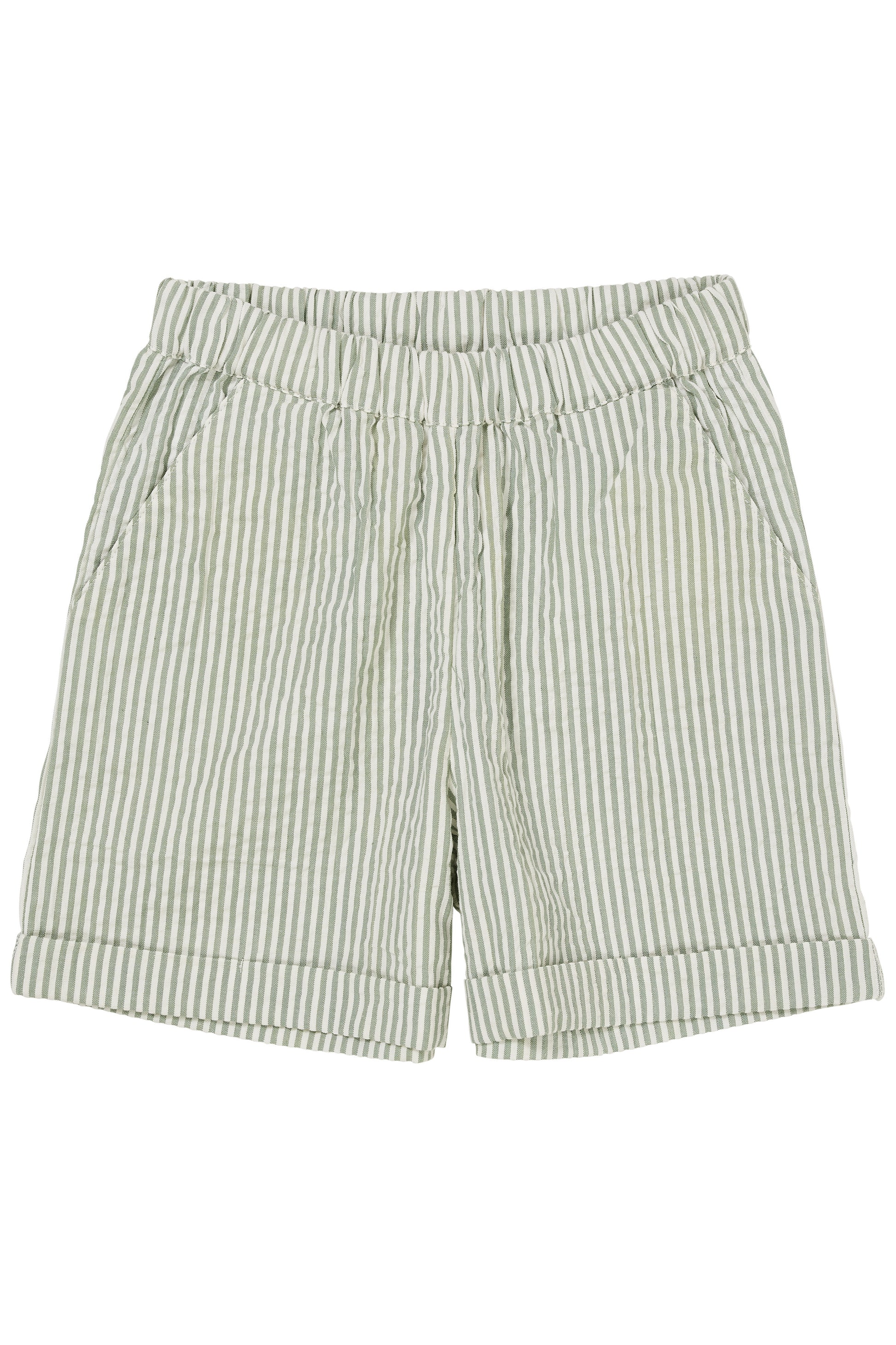 Dressed for playing without limits. These super cool unisex shorts are made from 100% organic cotton. The woven seersucker fabric is super soft and with a classic lt. blue stripe. Made for flexible and easy movement. Wash it again and again at 40 degrees and it never loses its shape. No lint and fading colors will be limited.Â